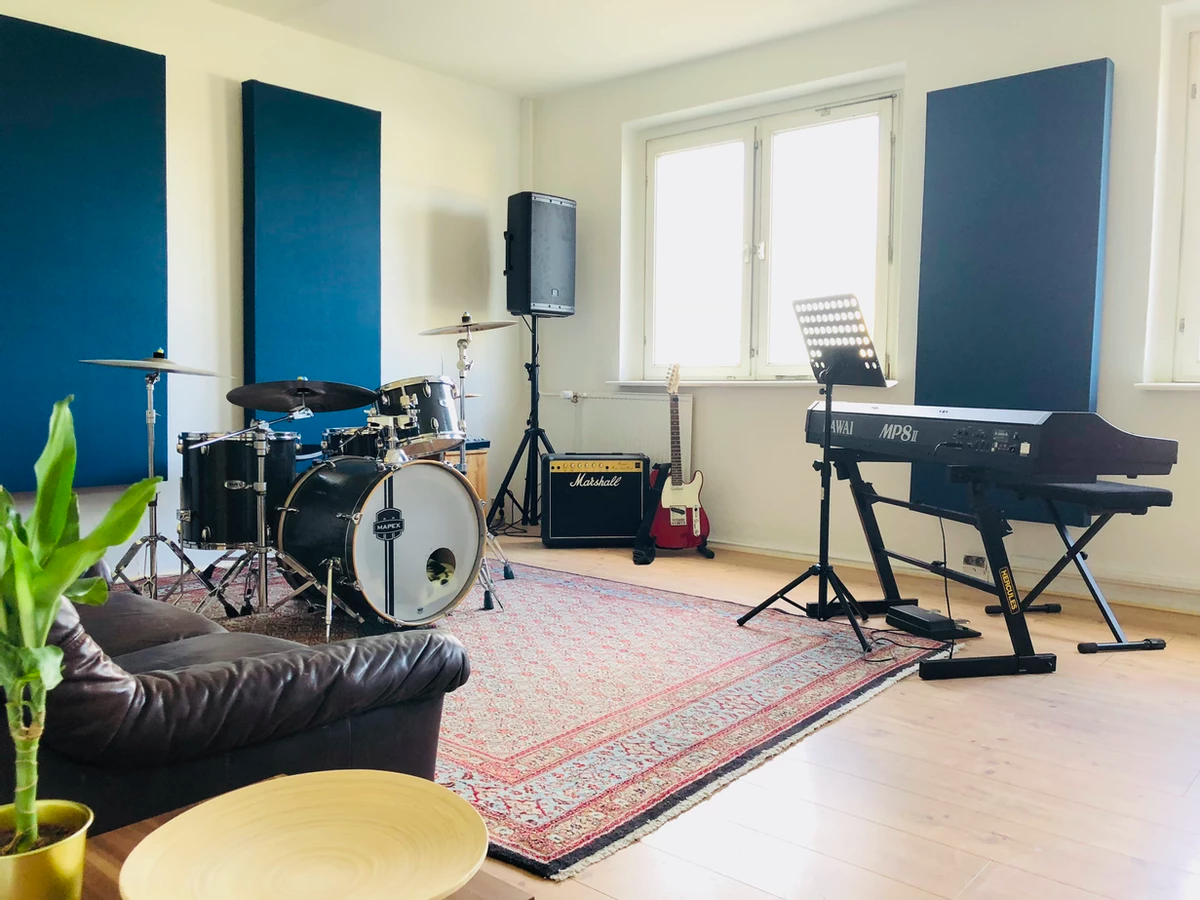 The 36 sqm room is equipped with a stage piano, guitar and bass amps, PA system, and a full drumset.